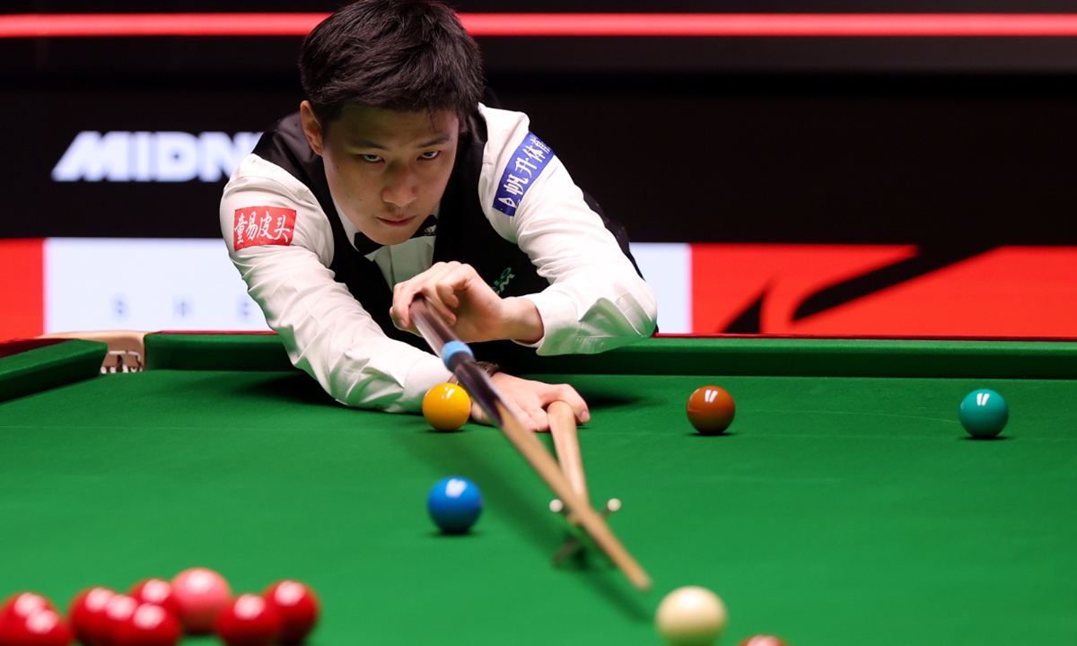 O chinês Zhao Xintong se prepara para jogar durante o décimo sétimo dia do Campeonato Mundial de Snooker Halo 2025, no Crucible Theatre, em 5 de maio de 2025, em Sheffield, Inglaterra. Foto: GT