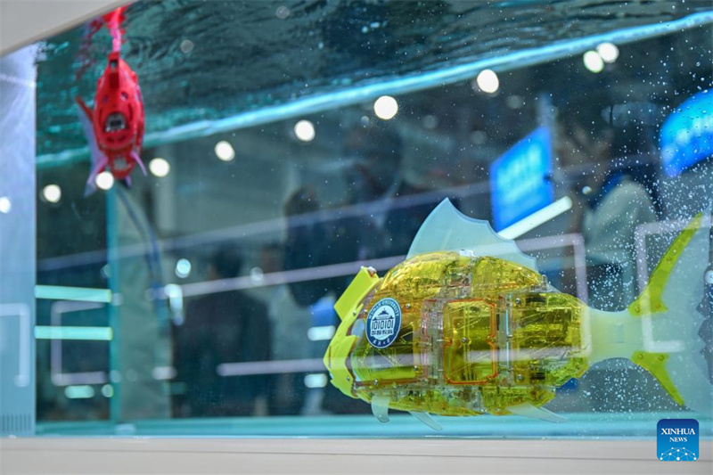 Peixe robótico com tecnologia de IA em exposi??o na Exposi??o de Conquistas em Educa??o Digital da Conferência Mundial de Educa??o Digital 2025.