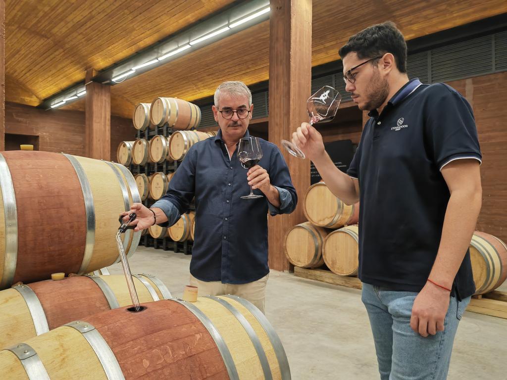 Nicolas Billot-Grima (E), cofundador da Stone and Moon Treasury Wine Estates, degusta vinho com Federico Carabajal, um enólogo argentino, numa adega na cidade de Qingtongxia, Regi?o Aut?noma da Etnia Hui de Ningxia, noroeste da China, em 7 de agosto de 2024.