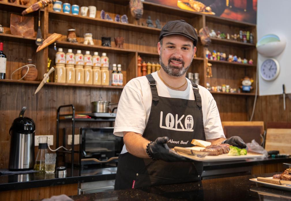 Gabriel Martin, um empresário do Uruguai, exibe o bife que acabou de preparar na churrascaria LOKO, na cidade antiga de Wuhu, na província de Anhui, no leste da China, em 20 de junho de 2024.