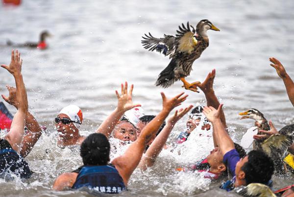 Nadadores competem para capturar patos no Rio Qingyi em uma competi??o de barco-drag?o no condado de Jiajiang, província de Sichuan, na quarta-feira. A tradi??o de capturar patos durante o Festival do Barco-Drag?o é observada em várias regi?es da China, incluindo Sichuan, Chongqing e a província de Hunan. (Liu Zhongjun/China News Service)