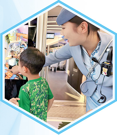 O trem possui janelas maiores para melhor visualiza??o panoramica, observou Ma. Inclui soleiras de porta rebaixadas, carpetes antiderrapantes, corrim?os fluorescentes e um sistema de chamada de emergência SOS. Também conta com suprimentos de emergência e um médico de emergência para lidar com situa??es inesperadas.
