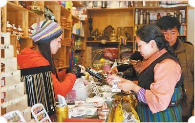 Turistas compram produtos típicos locais na vila Jifu, em Gyirong. Foto: Laba Zongji