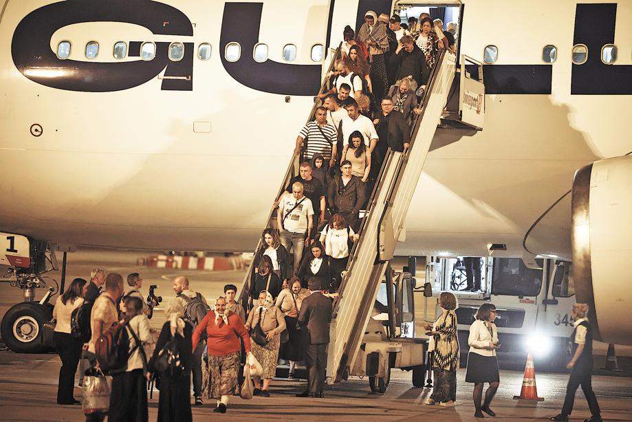 O primeiro grupo de cidad?os búlgaros evacuados de Israel, juntamente com dezenas de estrangeiros da Eslovênia, EUA, Bélgica, Albania, Kosovo e Romênia, chega ao aeroporto Vassil Levsky em Sófia, em 18 de junho de 2025. (Photo: Valentina Petrova/AP)