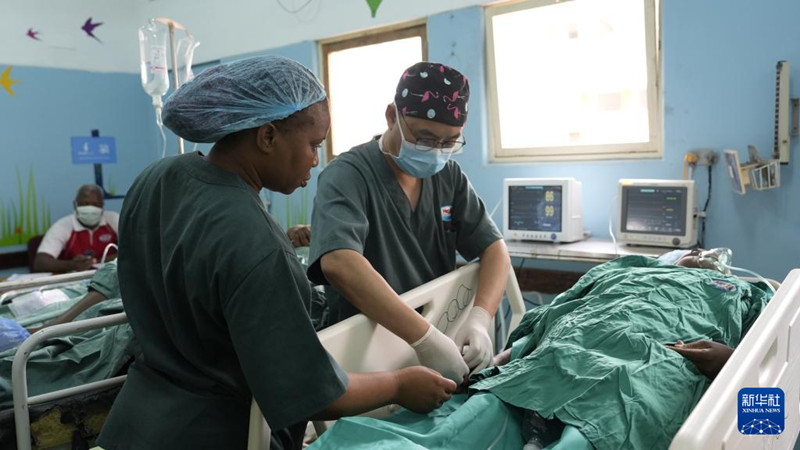 Médico Ling Yong (à direita), da equipe médica chinesa em Mo?ambique, realiza cuidados pós-operatórios com profissionais de saúde locais. (Foto: Liu Jie/Xinhua)