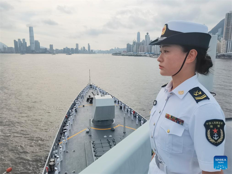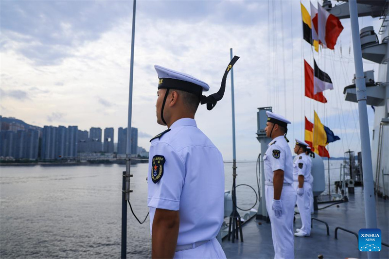 Soldados se alinham no convés do contratorpedeiro de mísseis Zhanjiang, durante sua visita a Hong Kong, sul da China, em 3 de julho de 2025. (Li Tang/Xinhua)