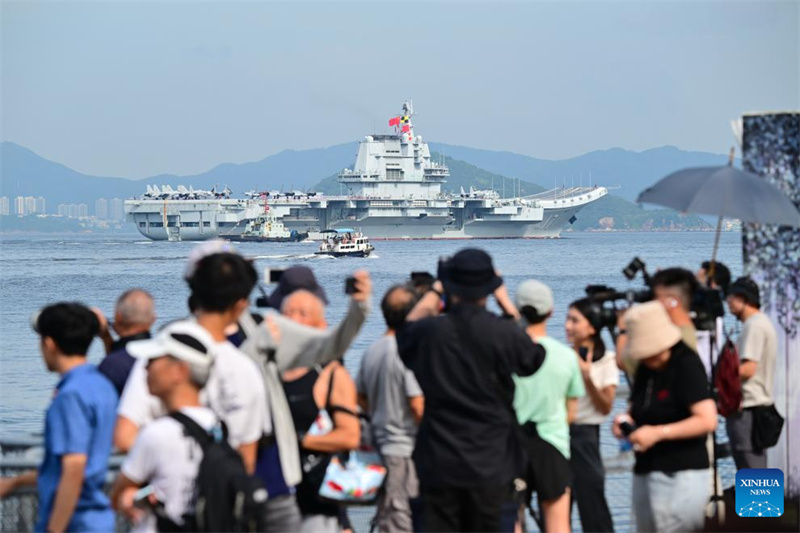 Por volta das 8h, a frota composta pelo Shandong e três outros navios entrou no Porto de Victoria. Mais de 700 oficiais e soldados formaram filas representando os caracteres chineses "país seguro, lar doce" no convés de voo do Shandong.