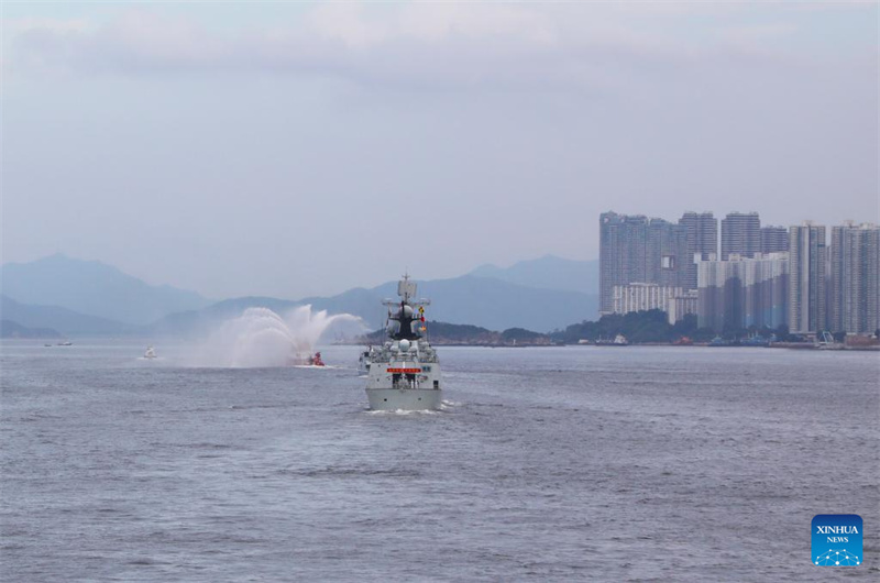 Um navio de combate a incêndios do governo da Regi?o Administrativa Especial de Hong Kong realiza uma cerim?nia para a frota da Marinha do Exército de Liberta??o Popular da China em Hong Kong, sul da China, em 3 de julho de 2025. (Li Yun/Xinhua)