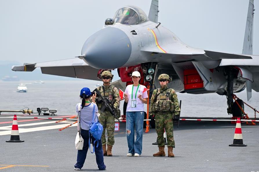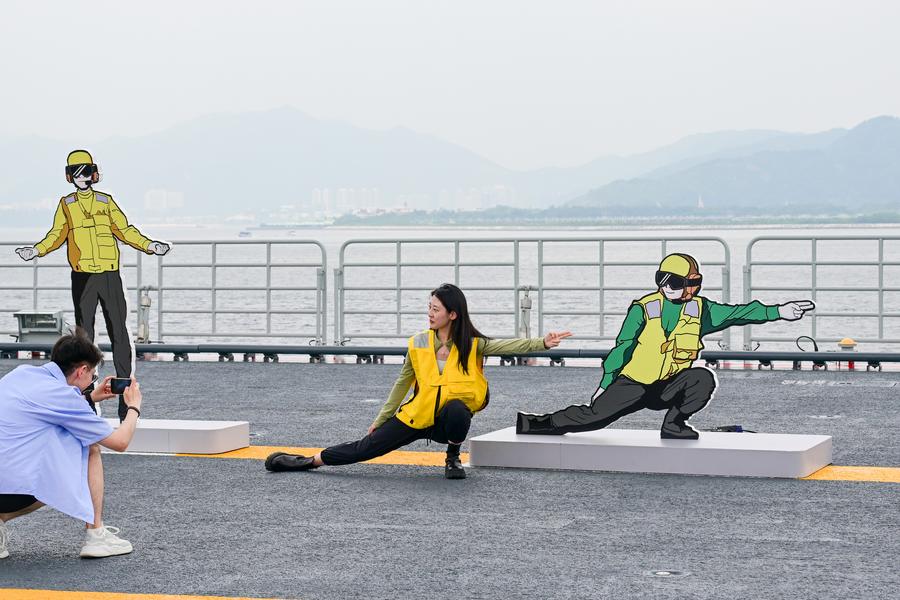 Visitante posa para fotos no porta-avi?es Shandong em Hong Kong, 5 de julho de 2025. [Foto/Xinhua]