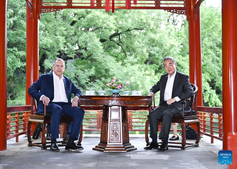 O Ministro das Rela??es Exteriores da China, Wang Yi, também membro do Bir? Político do Comitê Central do Partido Comunista da China, se reúne com o Ministro das Rela??es Exteriores da Rússia, Sergey Lavrov, em Beijing, capital da China, em 13 de julho de 2025. (Foto: Yan Yan/Xinhua)
