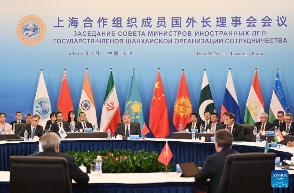 O ministro das Rela??es Exteriores da China, Wang Yi, também membro do Bir? Político do Comitê Central do Partido Comunista da China (PCCh), preside a reuni?o do conselho de ministros das Rela??es Exteriores dos Estados-membros da Organiza??o de Coopera??o de Shanghai (OCS) em Tianjin, norte da China, em 15 de julho de 2025. (Foto: Li Ran/Xinhua)