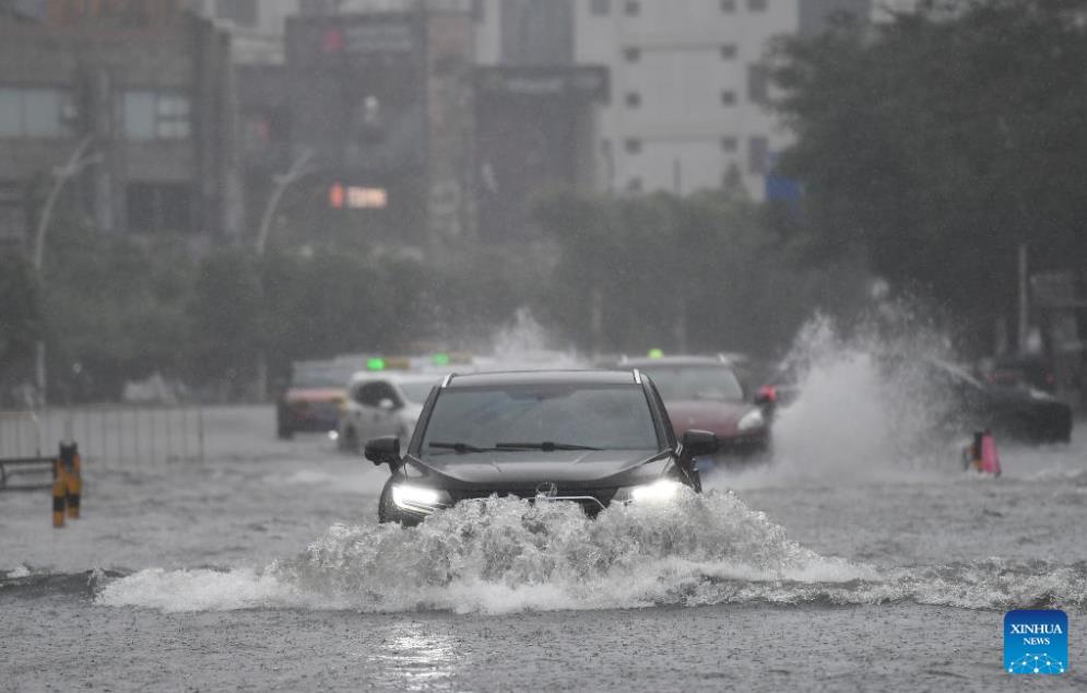 Veículos trafegam por uma área inundada em Haikou, província de Hainan, no sul da China, em 20 de julho de 2025. (Foto: Yang Guanyu/Xinhua)