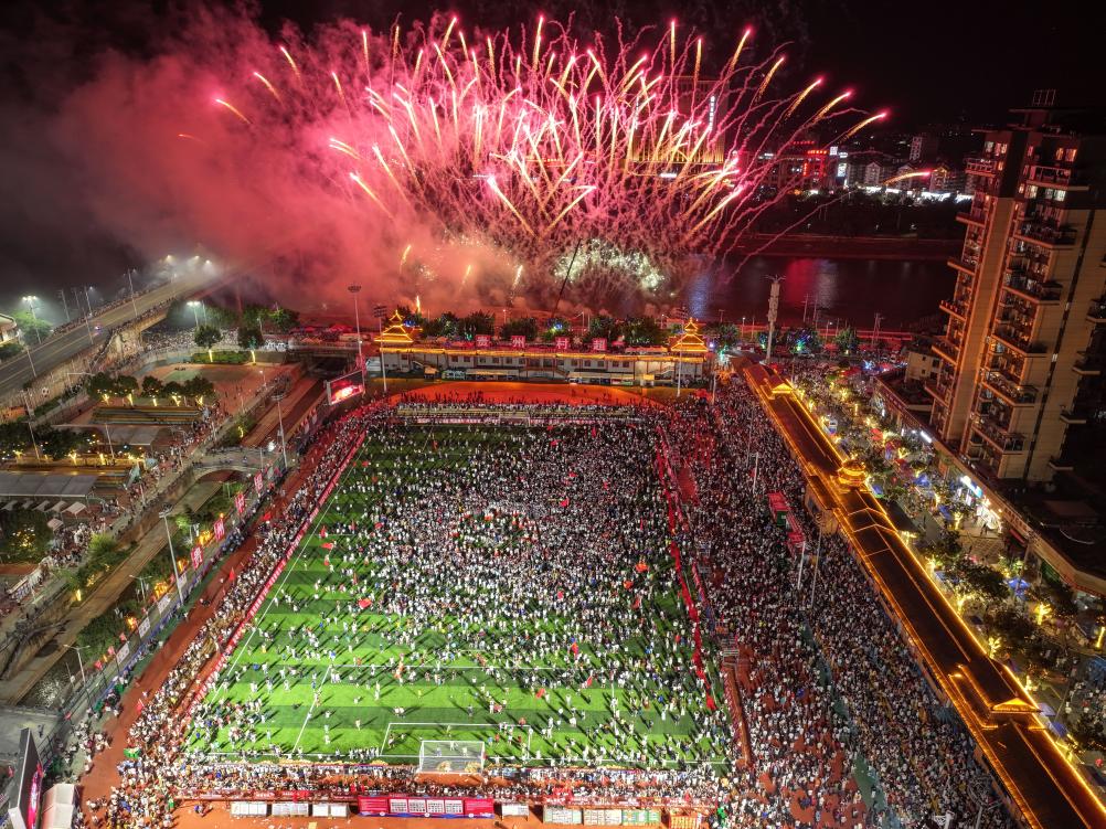 Foto do show fogo de artifício realizada em 26 de julho no estádio da Super Liga da Aldeia, em Guizhou (imagem feita por drone). Foto: Yang Wenbin / Xinhua