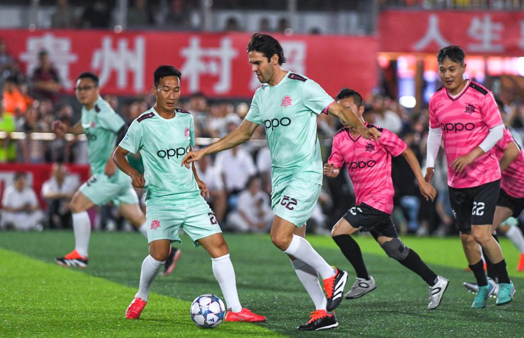 Em 26 de julho, Roberto Baggio (segundo à direita) e Roberto Carlos (à esquerda) participaram de atividades no estádio da Super Liga da Aldeia, em Rongjiang. (Foto: Long Jianrui / Agência Xinhua)