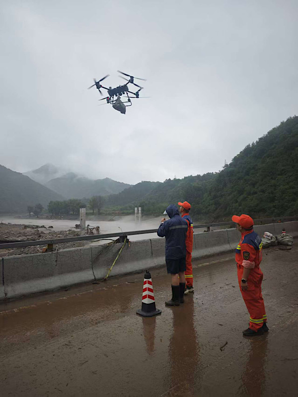às 11h da manh?, o primeiro drone decolou da Ponte No. 1 de Anzhouba, em Liulimiao, transportando alimentos e água potável, e lan?ou os suprimentos no vilarejo de Qian’anling.