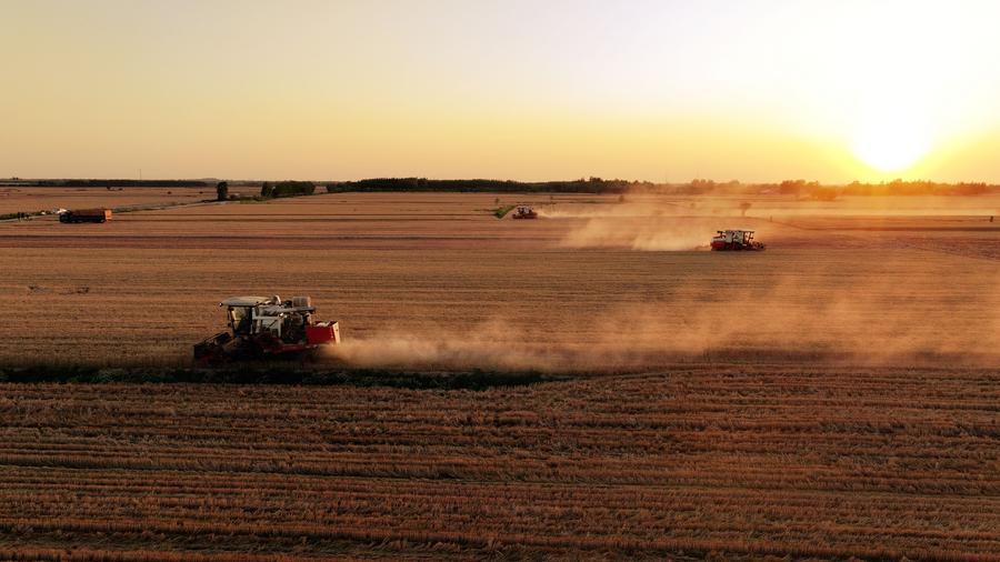 Colhedores trabalhando em campos de trigo na vila de Zhanghuzhuang, na cidade de Gaomi, província de Shandong, no leste da China, em 12 de junho de 2025. [Foto: Xinhua]