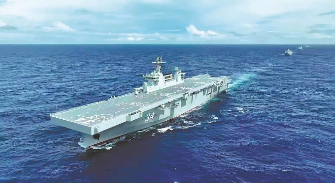 A Frota do Mar do Sul publicou no sábado (2) um videoclipe intitulado "Flamula número 34! CNS Hubei oficialmente revelado". O clipe mostrou a enorme embarca??o navegando ao lado do CNS Hainan, o primeiro da classe Tipo 075, e de várias plataformas de desembarque Tipo 071, no que parecia ser um exercício de forma??o.
