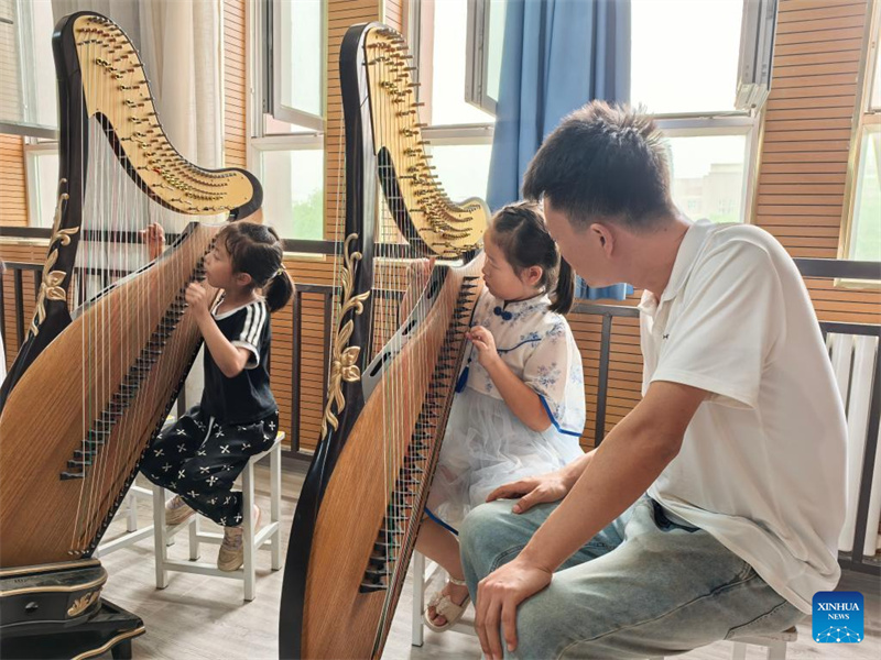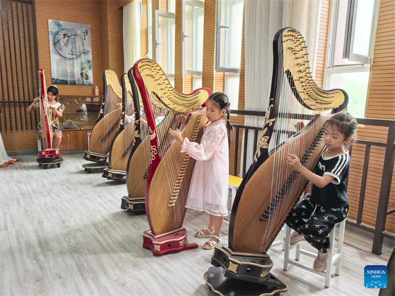Crian?as aprendem a tocar Konghou no Condado de Qiemo, Regi?o Aut?noma Uigur de Xinjiang, noroeste da China, em 11 de julho de 2025. (Foto: Gu Yu/Xinhua)