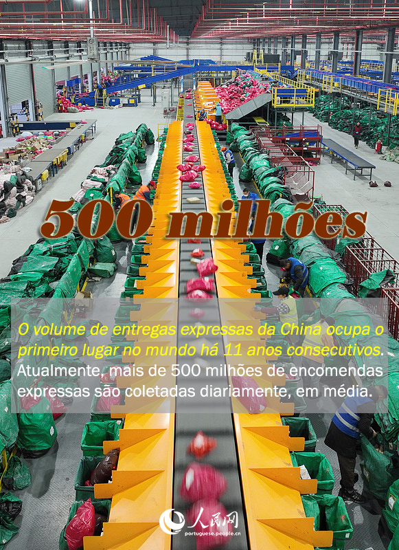 O volume de entregas expressas da China ocupa o primeiro lugar no mundo há 11 anos consecutivos. Atualmente, mais de 500 milh?es de encomendas expressas s?o coletadas diariamente, em média, o equivalente a quase 6.000 pacotes entrando no canal de entrega a cada segundo.