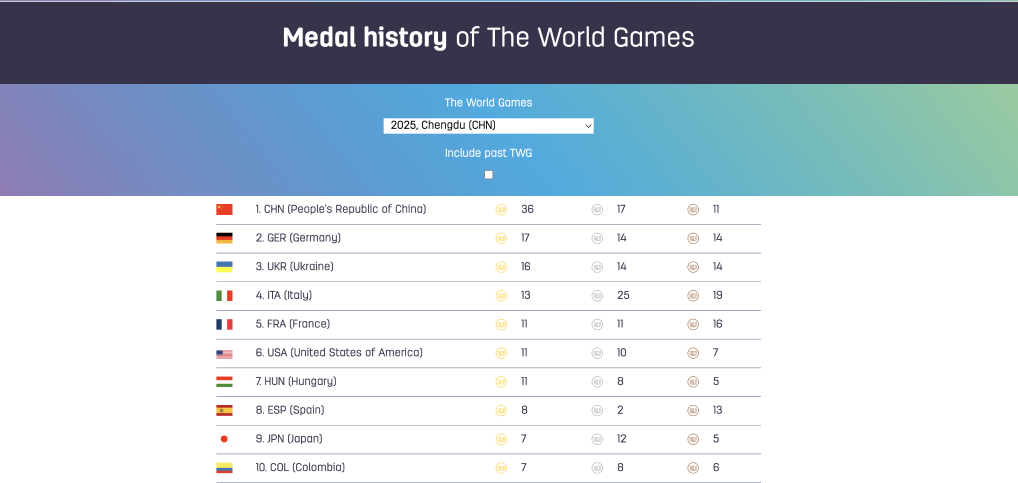 Liderando o quadro de medalhas de ouro e geral pela primeira vez, a China alcan?ou seu melhor desempenho nos Jogos Mundiais de Chengdu, anunciaram autoridades da delega??o chinesa no domingo.