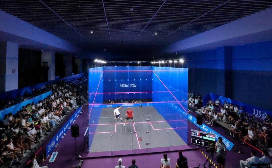 O squash também chamou a aten??o com quatro quadras de vidro azul, uma inova??o pioneira dos fabricantes chineses. A presidente da Federa??o Mundial de Squash, Zena Wooldridge, considerou o desenvolvimento um passo importante para tornar o esporte mais acessível.