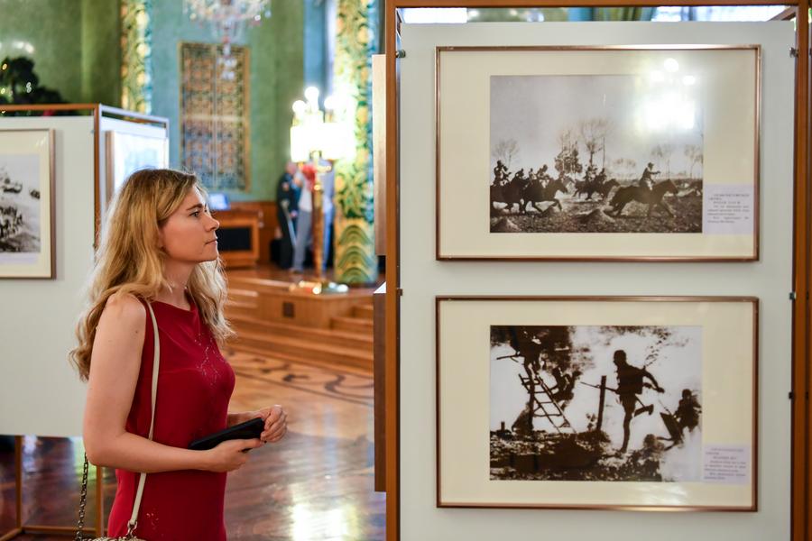 Uma visitante contempla a exposi??o fotográfica comemorativa do 80o aniversário da vitória na Guerra de Resistência do Povo Chinês contra a Agress?o Japonesa e na Guerra Antifascista Mundial, em Moscou, Rússia, em 24 de julho de 2025. (Xinhua/Cao Yang)