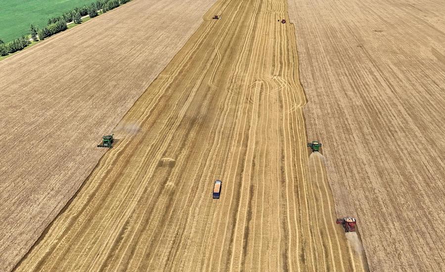 Vista aérea de colheitadeiras colhendo trigo no campo na cidade de Heihe, província de Heilongjiang, no nordeste da China, em 5 de agosto de 2025. (Foto: Lu Wenxiang/Xinhua)