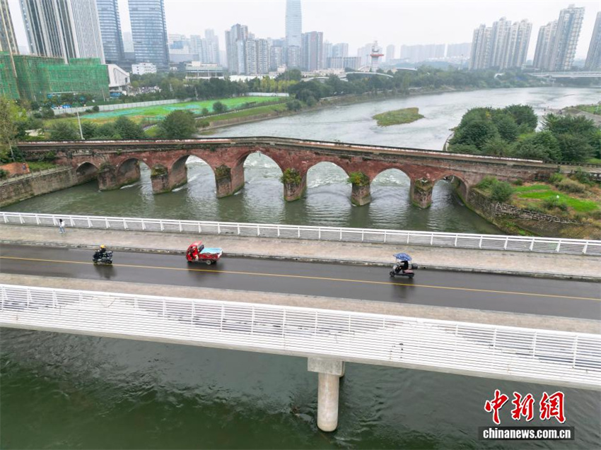 Vista aérea da Ponte Antiga do Templo Erjiang, em Chengdu, província de Sichuan, mostra uma espada de ferro pendurada em seu arco central sobre o Rio Jinjiang, criando o espetáculo da "Espada Pendurada na Ponte Antiga", em 31 de outubro de 2025.