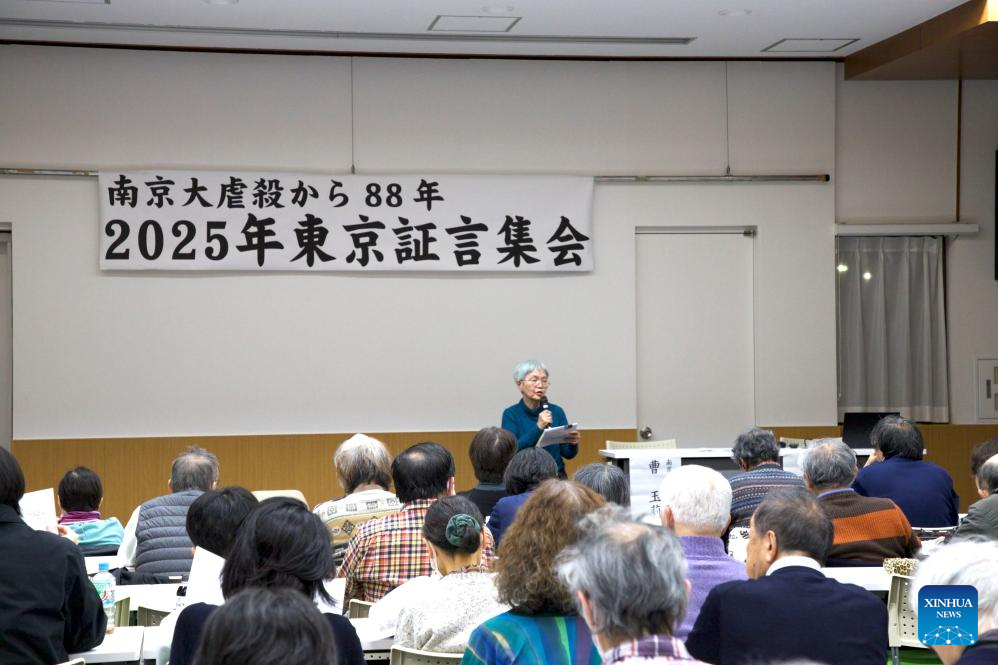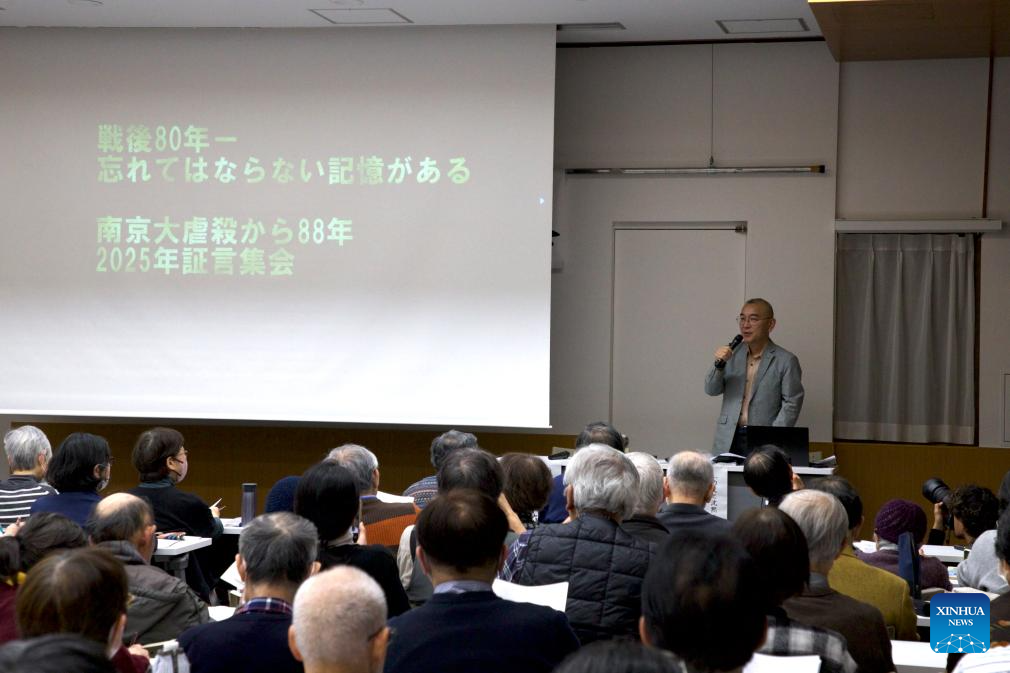 Akinobu Ito, presidente da Associa??o de Intercambio de Trabalhadores Jap?o-China, discursa em uma reuni?o de depoimentos sobre o Massacre de Nanjing em Tóquio, Jap?o, em 11 de dezembro de 2025. (Xinhua/Li Ziyue)