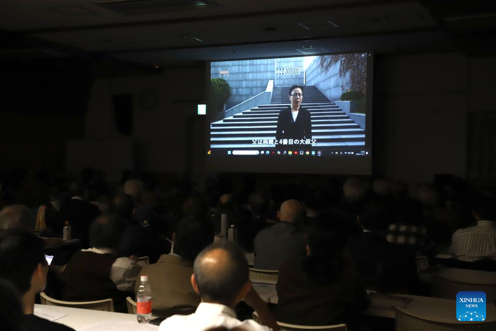 Cao Yuli, filha de dois sobreviventes do Massacre de Nanjing, fala em um depoimento em vídeo durante uma reuni?o sobre o Massacre de Nanjing em Tóquio, Jap?o, em 11 de dezembro de 2025. (Xinhua/Li Ziyue)